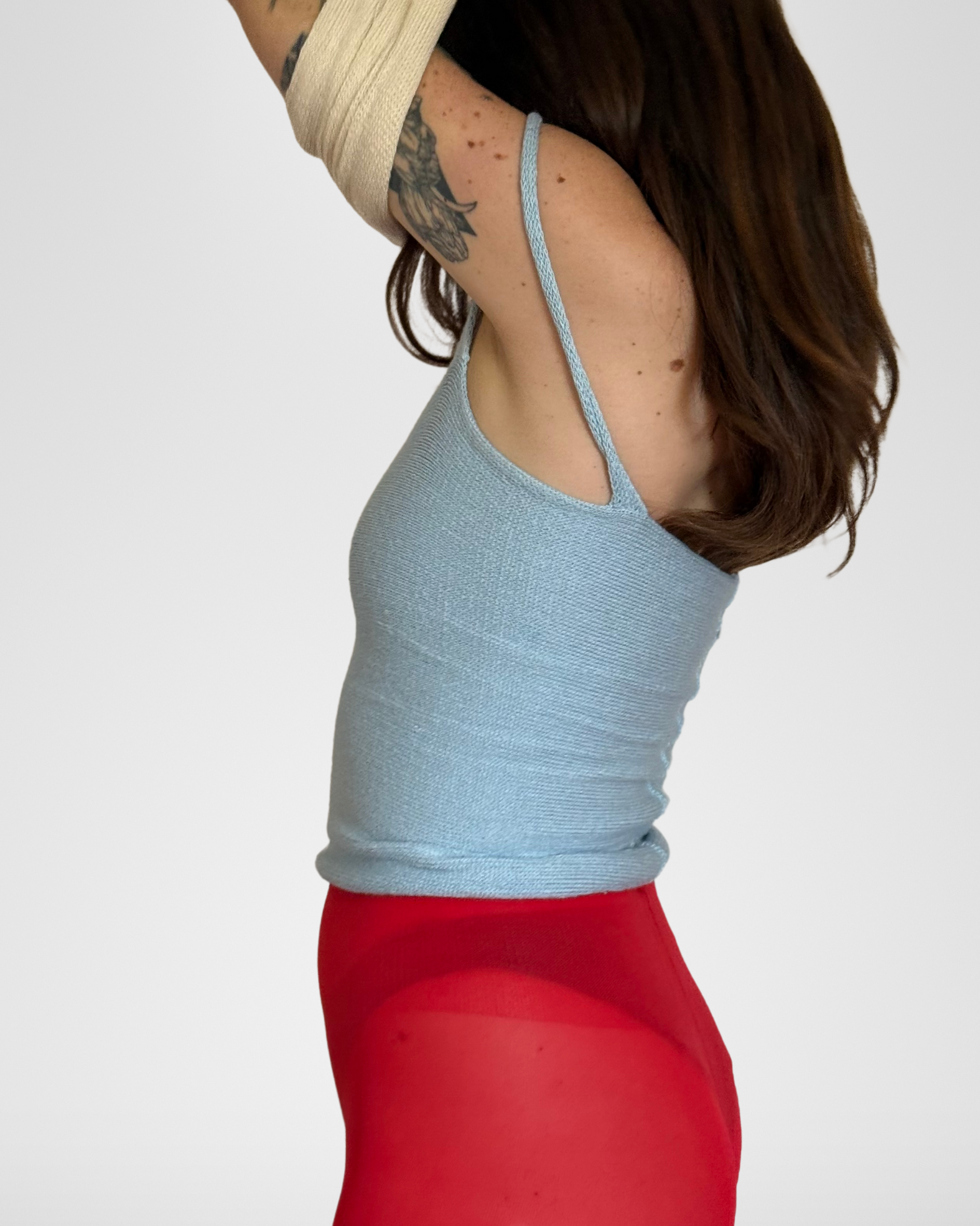 Skinny Strap Tank. Top is made with soft, stretchy cotton. The back of the garment comes embellished with a single pearl.