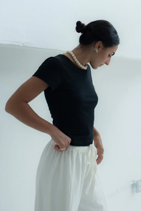 A snug little t-shirt. The short sleeves are designed for an ideal fit (not too short, not too long), while the slightly cropped length offers versatile styling options. This piece transitions seamlessly between baggy or fitted bottoms. True-to-size fit that starts snug and gradually relaxes with wear.