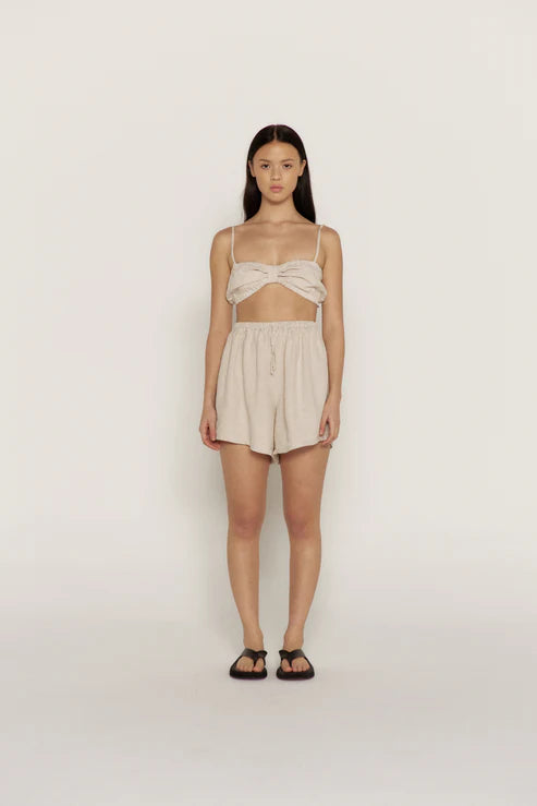 Bohème short goes with everything and is a nod to 90's simplicity with an elasticated waist. Roll the waist band for a shorter length.