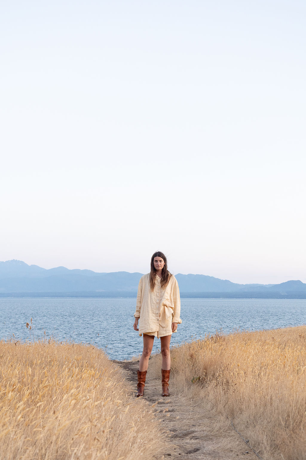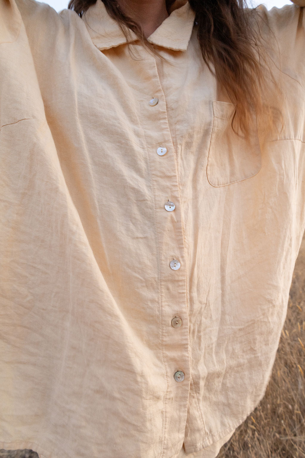 Made in Vancouver from antique wash linen our oxford shirt features an oversized fit, hidden collar button and agoya shell buttons.