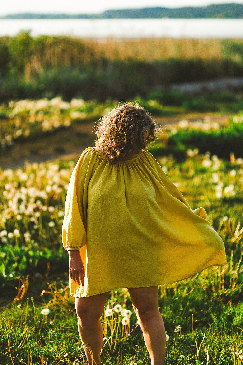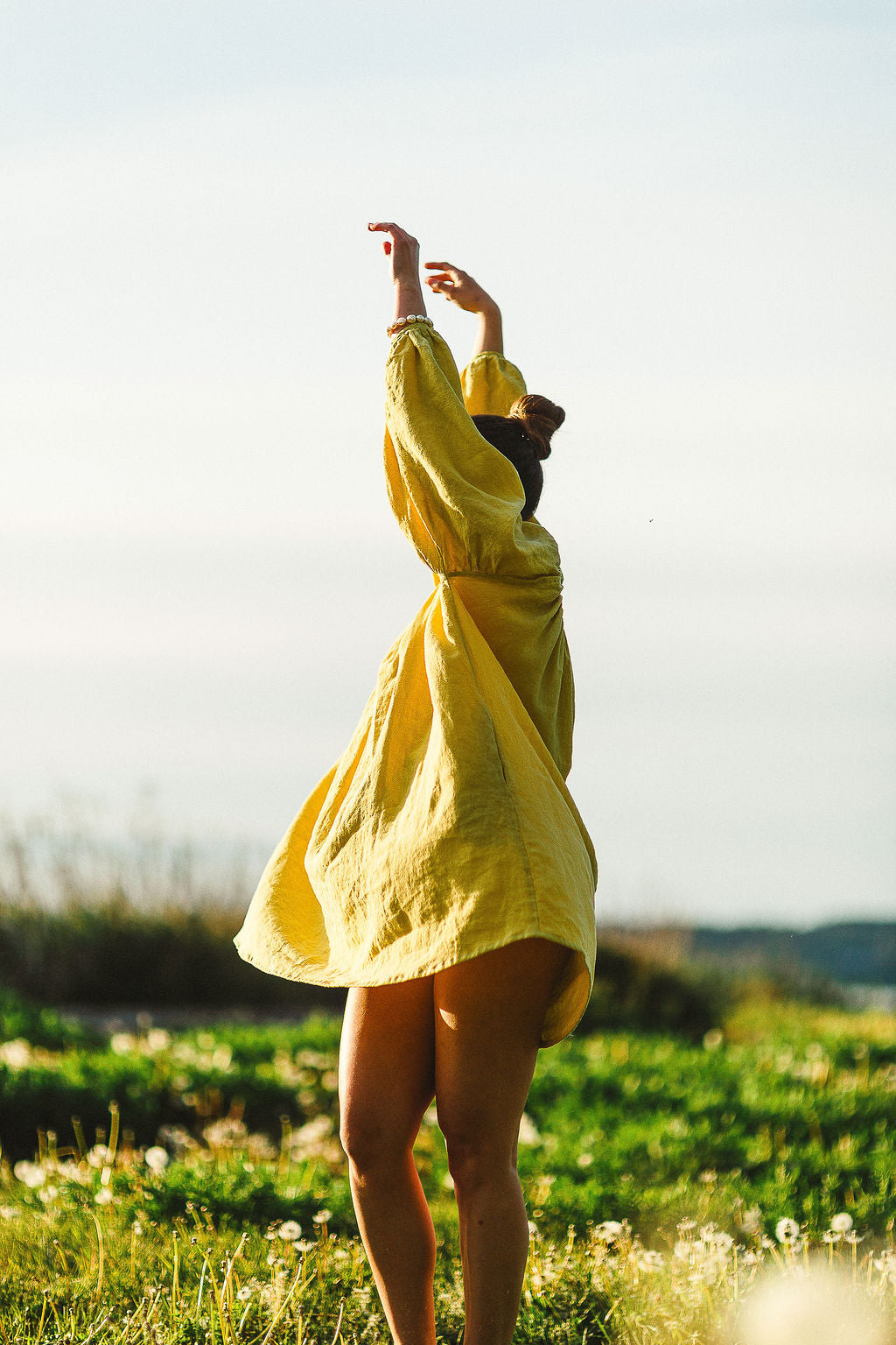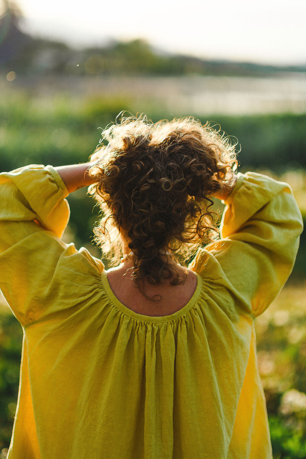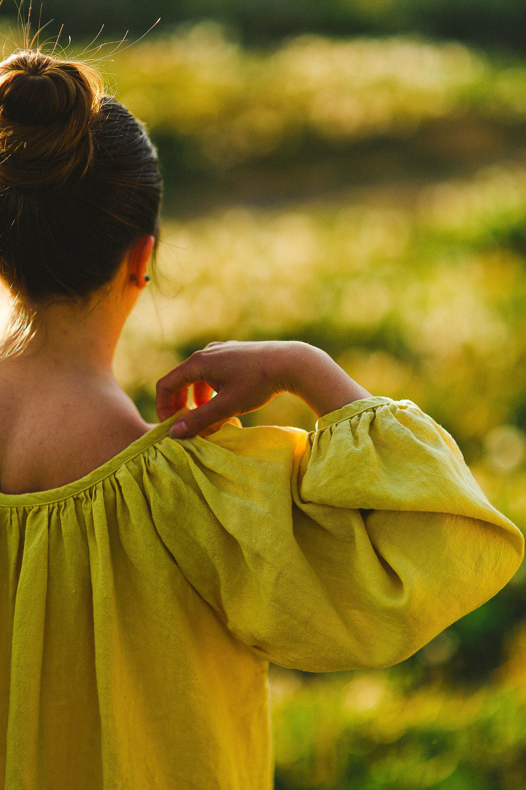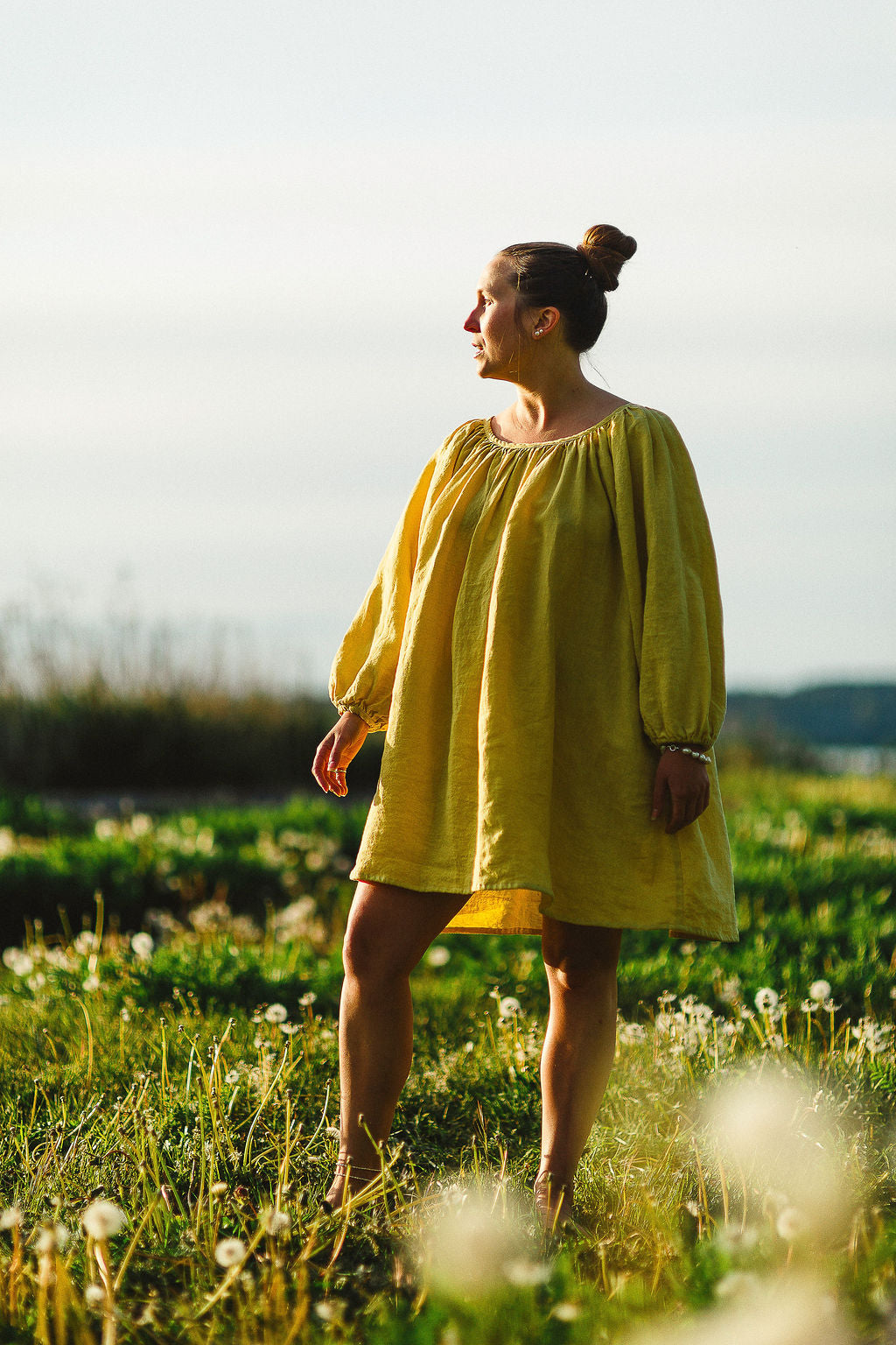 A twirl worthy dress inspired by 1960’s sleepwear. The Mini Olive Dress is fashioned with romantic puff sleeves, a gathered neckline and wrists and deep pockets.
