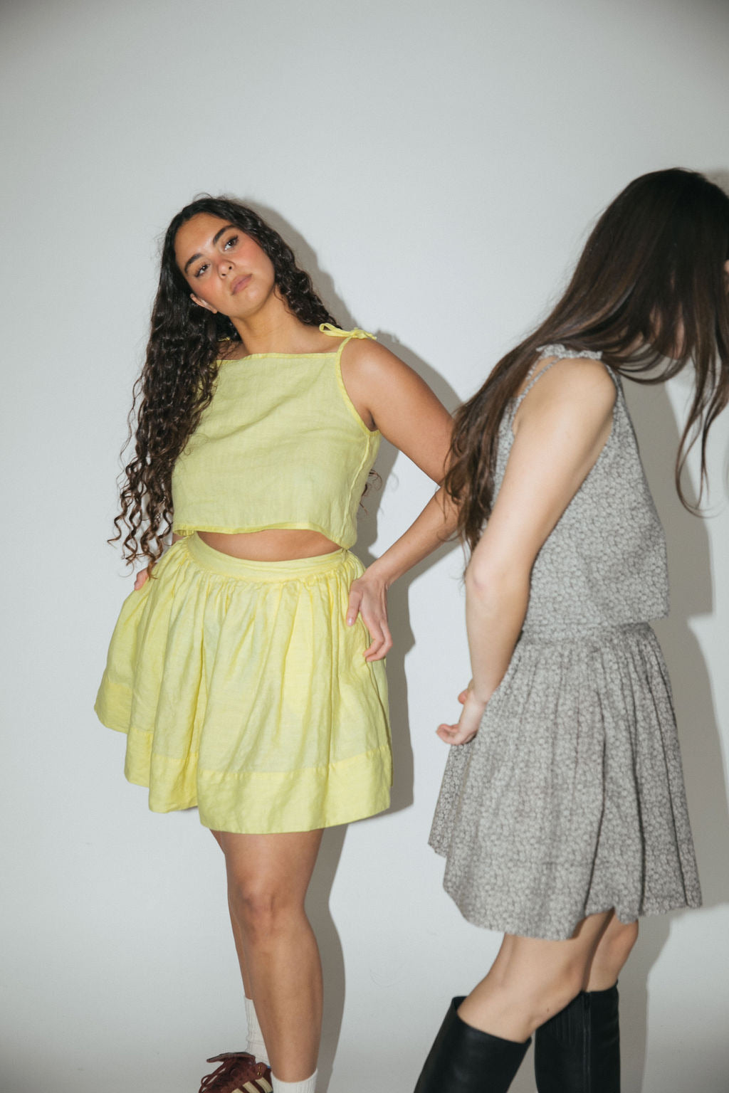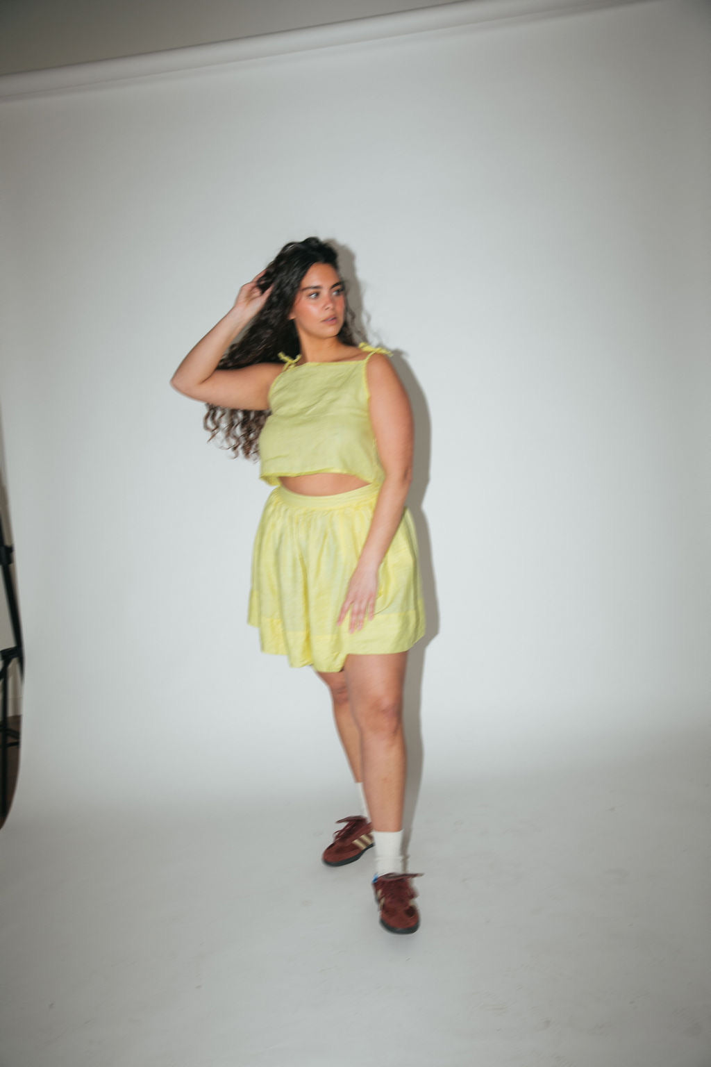 A versatile mini crop tank with adjustable tie closures at the shoulder which allow for adding length in the body or making extra mini as well as changing the neckline for different vibes.