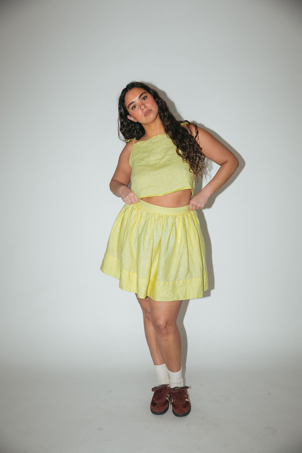 A bouncy, twirly skirt that is mini in length. Featuring pleats all around, deep pockets, a back zipper and button closure.