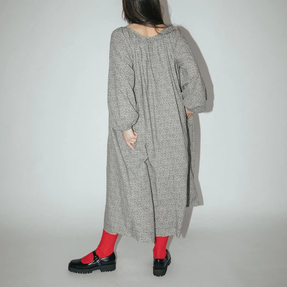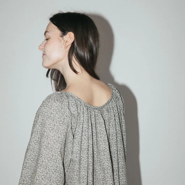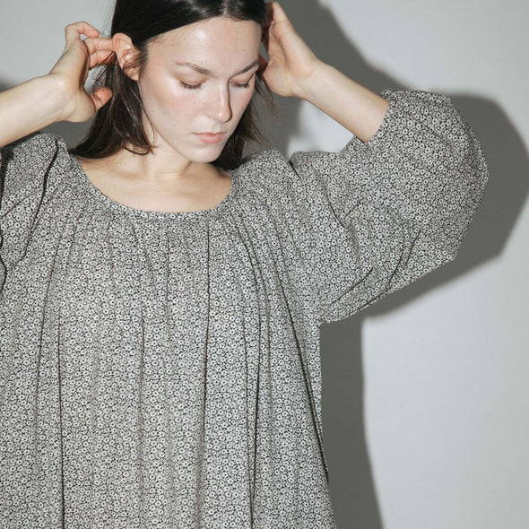A twirl worthy dress inspired by 1960’s sleepwear, the Olive Dress is a midi length fashioned with puff sleeves, a gathered neckline and wrists, and pockets.