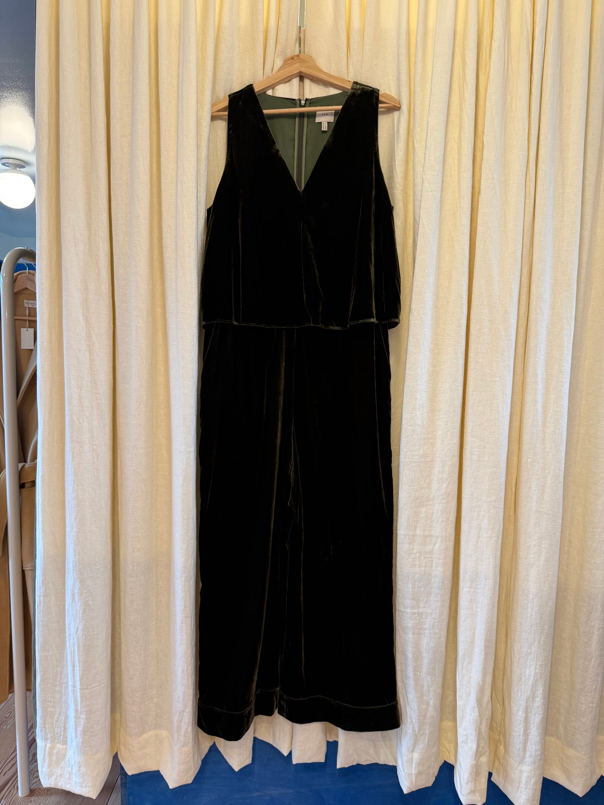 ELK The Label Velvet Jumpsuit. Perfect for a holiday party! V-neck. Fitted Waist. Pockets.