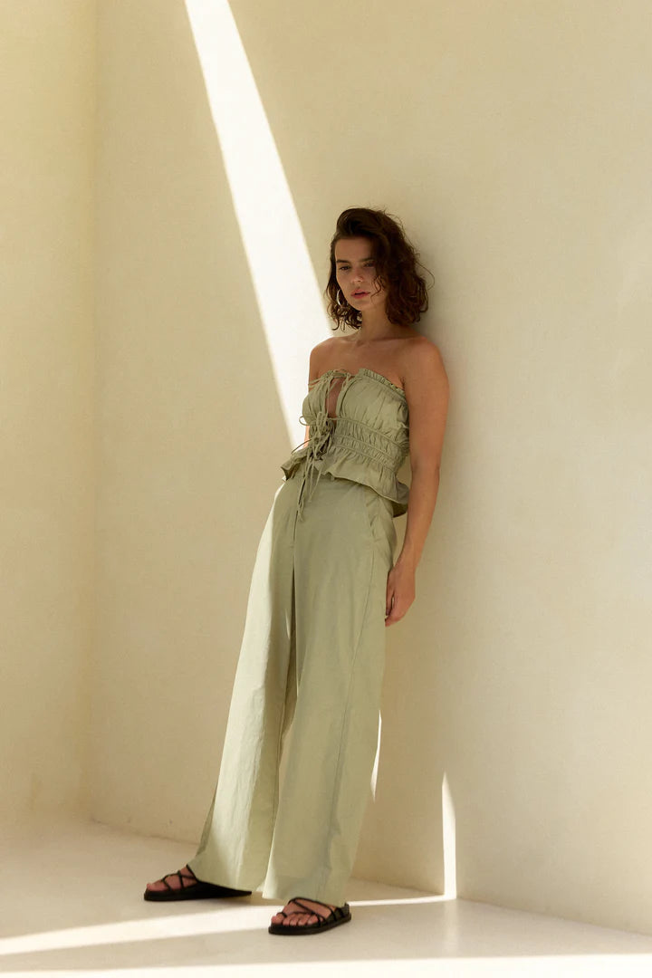 Tailored high waist trouser crafted in a soft cotton poplin. Zipper fly. Belt loops. Side pockets. Wide leg. Wear with the EVO Button Up.