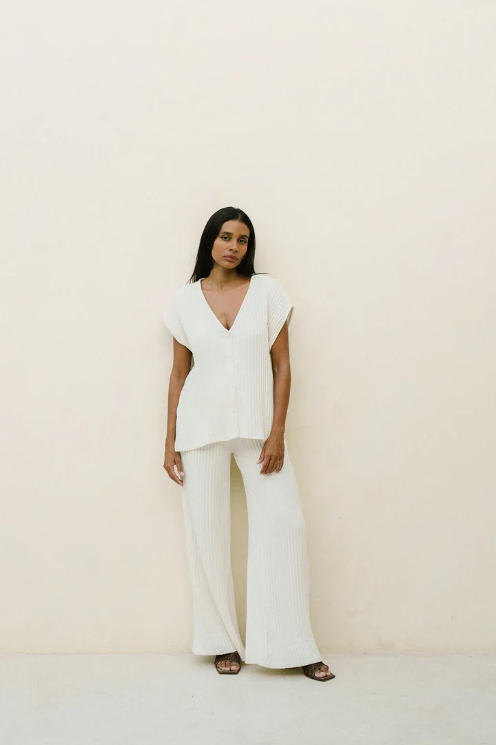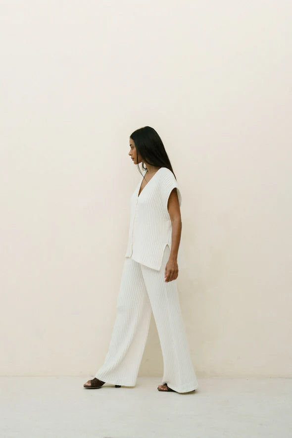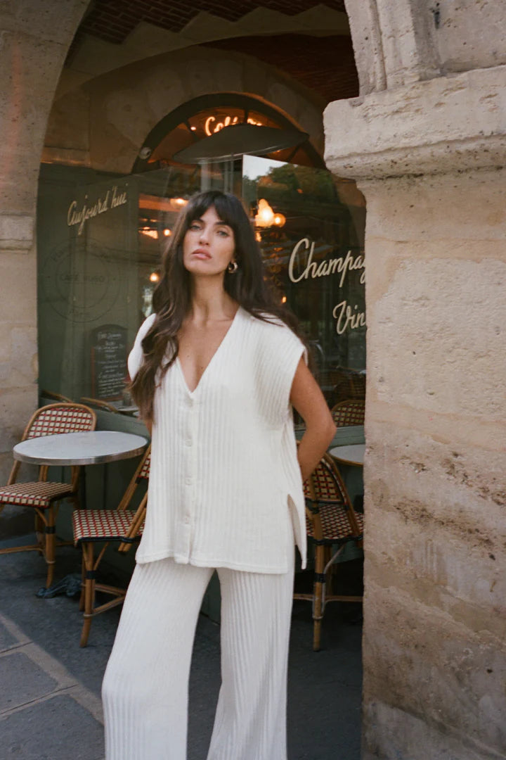 A slightly oversized heavyweight knit cotton vest. Featuring a button up entry, side splits and a deep V neckline. Style tip: tuck into pants.