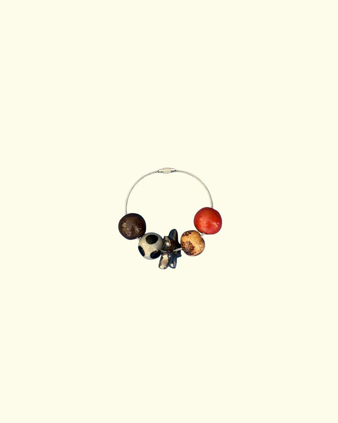 A keychain made by ceramicist Ami Sangha. Featuring five chunky hand made, hand painted ceramic beads on a wire ring. Can also be used as a bag charm!