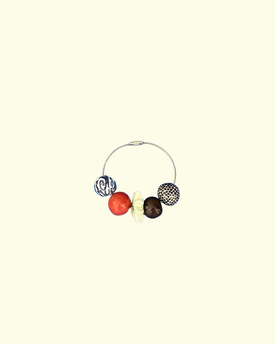 A keychain made by ceramicist Ami Sangha. Featuring five chunky hand made, hand painted ceramic beads on a wire ring. Can also be used as a bag charm!